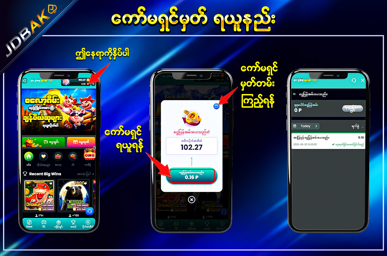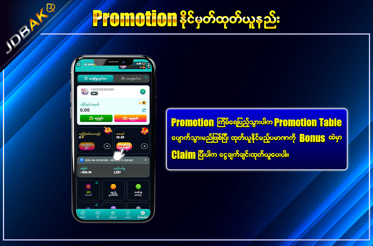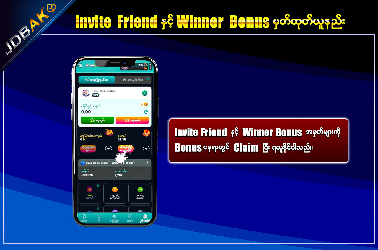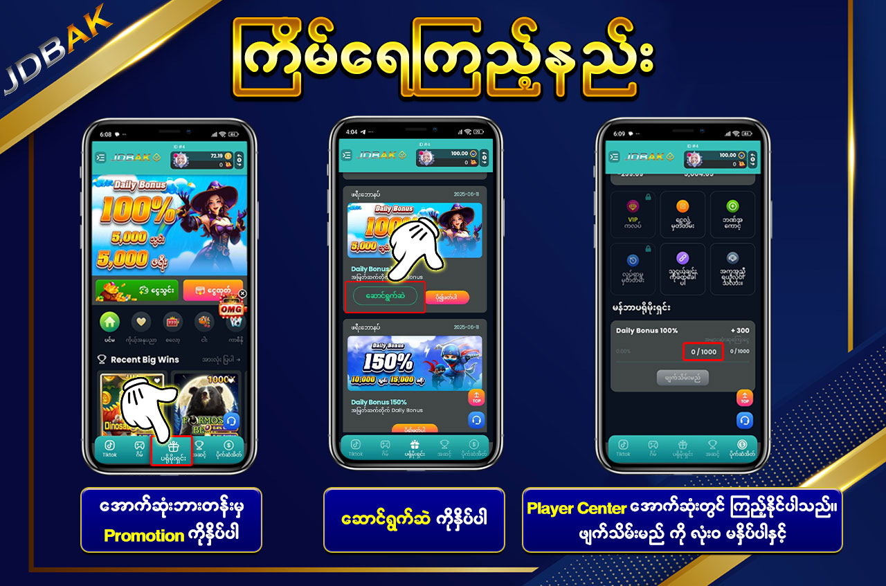 jdbak မှ အထူးပေးအပ်သော “Daily Cash Back Commission” ကို အသုံးပြုပြီး သင့်ရဲ့ ကစားမှုများအပေါ်မှ နေ့စဉ်အမြတ်ပြန်အမ်းကို ရယူနိုင်ပါသည်။