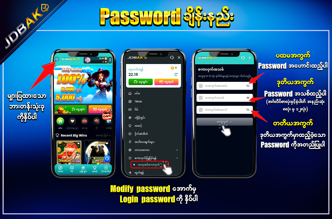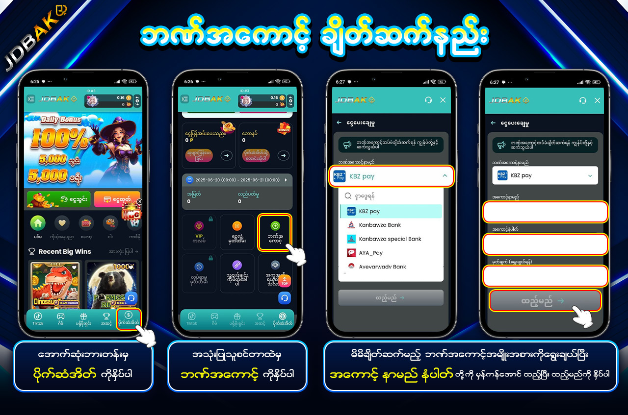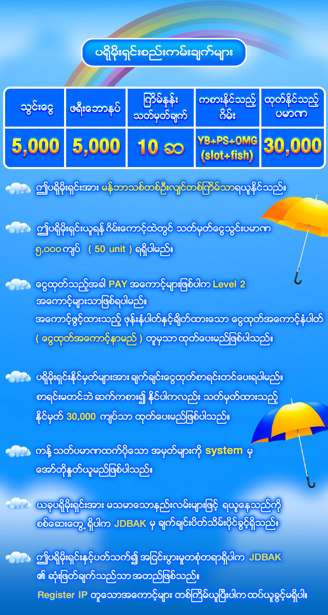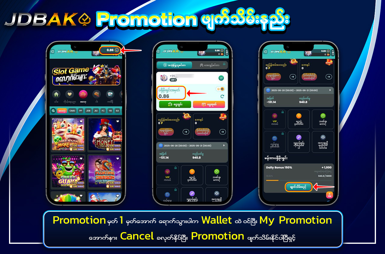 jdbak မှ အထူးပေးအပ်သော “Daily Cash Back Commission” ကို အသုံးပြုပြီး သင့်ရဲ့ ကစားမှုများအပေါ်မှ နေ့စဉ်အမြတ်ပြန်အမ်းကို ရယူနိုင်ပါသည်။