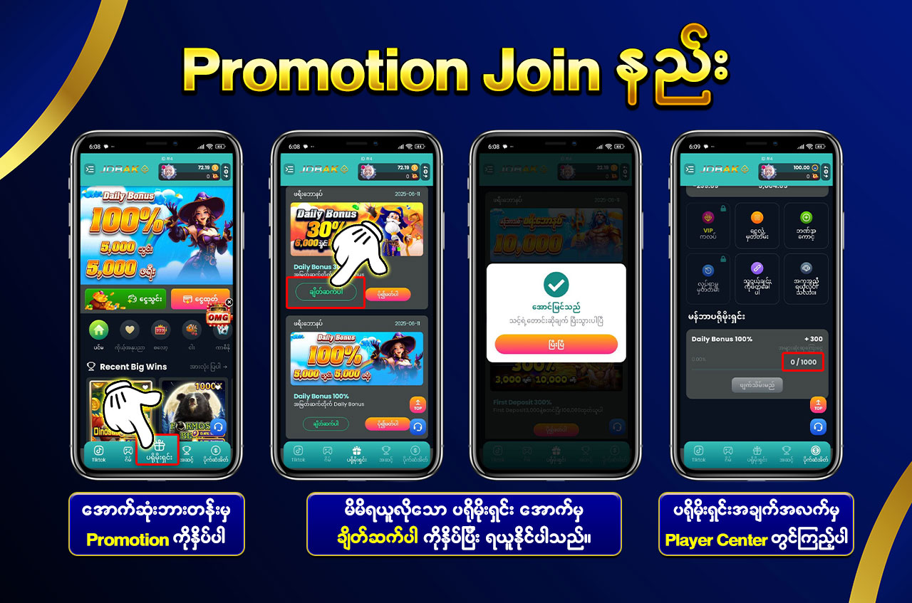 OMG 100% ဆိုတာကတော့ slot game နှင့် casino platform တွေအတွက် လူကြိုက်များတဲ့ အပိုဆုပရိုမိုးရှင်း တစ်ခုပဲဖြစ်ပါတယ်။ ဘဏ်ထဲသွင်းလိုက်တာနဲ့ လက်ငင်း ၁၀၀% โบนัส ရရှိမှာ ဖြစ်ပါတယ်။ ဥပမာ – ၁၀,၀၀၀ MMK ထည့်လိုက်ရင် ၂၀,၀၀၀ MMK ဖြင့် ကစားနိုင်မယ်ဆိုတာပါ!