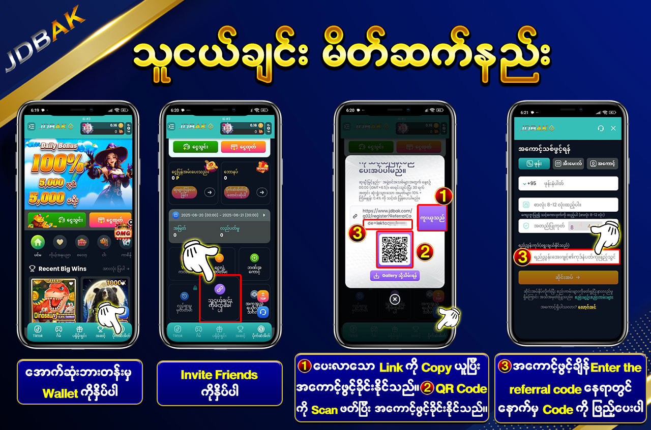 jdbak တွင် Referral Bonus အစီအစဉ်ကို အသုံးပြု၍ မိတ်ဆွေများကိုဖိတ်ခေါ်ပြီး ငွေသားအပိုများရယူနိုင်ပါပြီ။ မည်သည့်အချိန်တွင်မဆို မိတ်ဆွေတစ်ဦးခေါ်လို့ရင် โบนัสရရှိမယ်ဆိုတာ မျှော်လင့်မထားလို့ဖြစ်ပါတယ်။